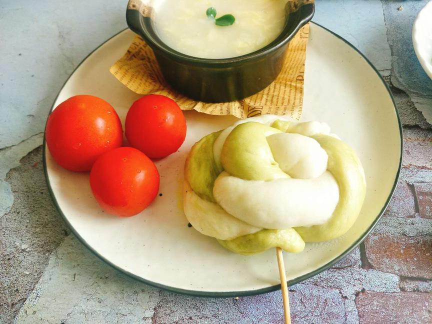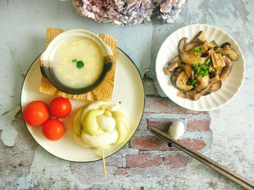 #早餐# 鸡蛋汤、耗油香菇、棒棒糖馒头、圣女果